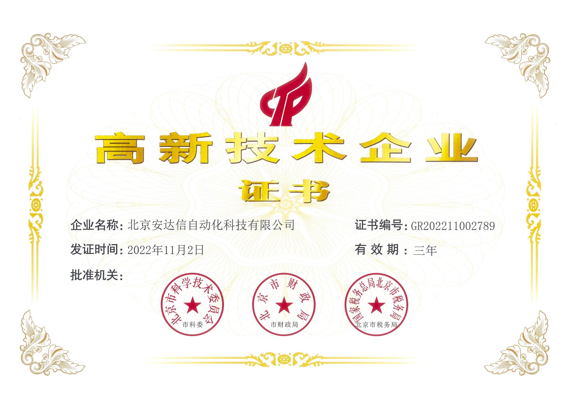 科學(xué)技術(shù)部火炬高技術(shù)產(chǎn)業(yè)開發(fā)中心網(wǎng)站于2022年11月發(fā)布公告。根據(jù)《高新技術(shù)企業(yè)認定管理辦法》(國科發(fā)火〔2016〕32號)和《高新技術(shù)企業(yè)認定管理工作指引》(國科發(fā)火〔2016〕195號)有關(guān)規(guī)定,北京安達信自動化科技有限公司(以下簡稱“公司”)成功通過了北京市認定機構(gòu)2022年認定的第二批“高新技術(shù)企業(yè)”。